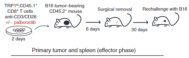 为了确定CDK4/6抑制剂对肿瘤特异性CD8T细胞的影响,Dougan教授团队从TRP1(黑色素瘤抗原酪氨酸酶相关蛋白1)转基因小鼠中分离了TRP1特异性CD8T细胞,在体外用palbociclib(CDK4/6抑制剂)刺激它们,48小时后将这些细胞过继转移到接种黑色素肿瘤的小鼠身上,六天后,手术切除该侧肿瘤,再让小鼠休息30天。目的是让效应CD8T细胞减少,留下记忆性CD8T细胞。