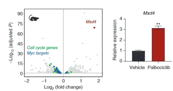 接下来他们从小鼠脾脏中分离出CD8T细胞,将这些细胞分成两组,一组用palbociclib处理,一组不用palbociclib处理,并用抗CD3/28磁珠活化48小时。48小时后,研究人员分别给两组细胞做了RNA测序,结果发现 两组细胞中差异最大的基因是Mxd4。